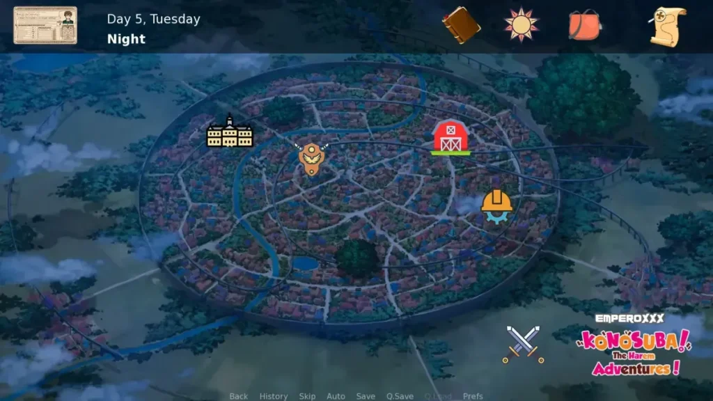 * Stat Management: Improving Kazuma’s skills like Stealth, Intelligence, and Charisma through activities like foraging or gambling.